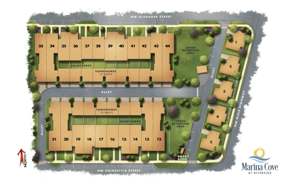 The Marina Cove site plan reflects a pedestrian friendly neighborhood design with private courtyards, rear loaded garages, and clearly defined streetscapes. Thoughtful circulation, landscaped buffers, and alley access help preserve the community’s intimate scale while enhancing walkability and curb appeal. The layout balances privacy and connectivity, creating a cohesive neighborhood that feels both intentional and welcoming.