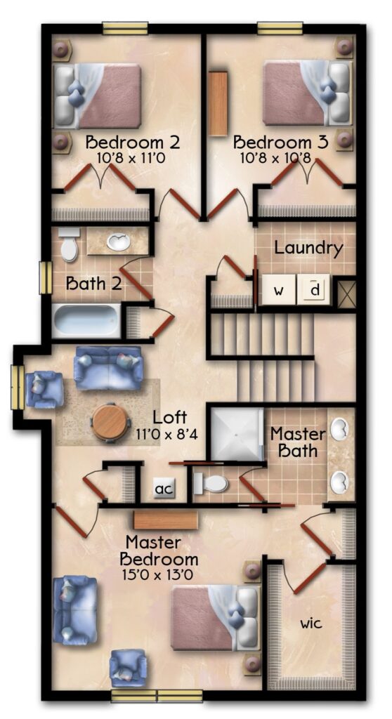 The Summerland features an inviting first floor centered around open concept living. A spacious great room connects seamlessly to the kitchen and dining area, creating a warm and welcoming hub for daily life and entertaining. Upstairs, a private primary suite, secondary bedrooms, and a cozy loft provide room for relaxation and retreat.